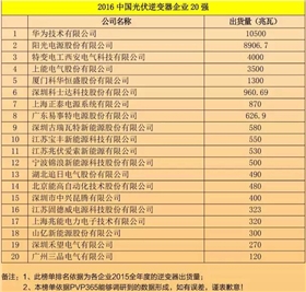 本次榜單包含七大類榜單,其中2016中國光伏逆變器企業(yè)20強排名如下:華為技術(shù)有限公司以出貨量10500兆瓦位居第一名,陽光電源股份有限公司出貨量8906.7兆瓦和特變電工西安電氣科技有限公司出貨量4000兆瓦進入前三。