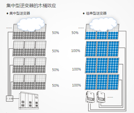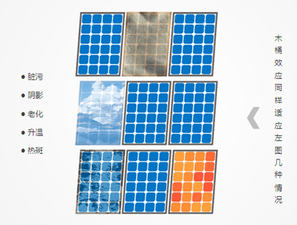 第一,避免了集中型逆變器電站的木桶效應(yīng)(如下圖)。集中式并網(wǎng)逆變系統(tǒng)中,組件方陣經(jīng)過兩次匯流到達逆變器,逆變器最大功率跟蹤功能(MPPT)不能監(jiān)控到每一路組件的運行情況,因此不可能使每一路組件都處于最佳工作點,當(dāng)有一塊組件發(fā)生故障或者被陰影遮擋,會影響整個系統(tǒng)的發(fā)電效率。所以當(dāng)電池組件受到遮擋時,集中型電站會受到較大的影響,組串型電站只有被遮擋的一串對應(yīng)的一路MPPT受到影響。而正常情況下,各個組件之間的安裝間距,安裝角度各異,一天中一定時間內(nèi)不可避免會產(chǎn)生局部遮擋,特別是早晚時刻太陽高度角較低的時候,或者出現(xiàn)一些植被遮擋一些電池片。若一個500KW方陣的電池板使用一路MPPT來跟蹤,會損失一定的發(fā)電量。該情況同樣適用于當(dāng)電池組件發(fā)生臟污、陰影、老化、升溫、熱斑的情況下。